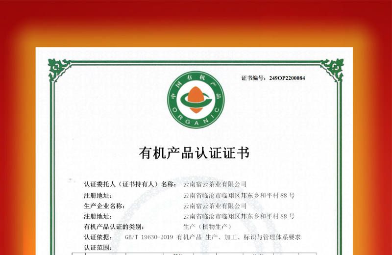 宿云古樹茶榮獲中國有機產品認證證書