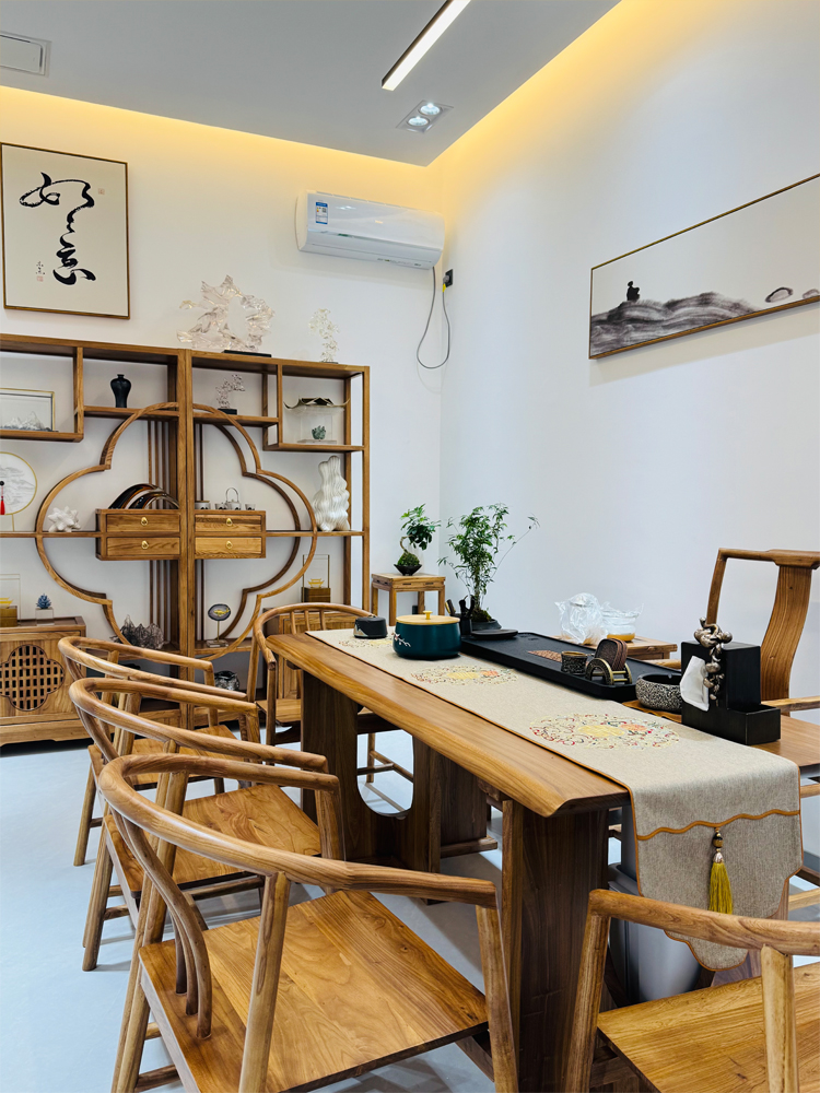 宿云古樹茶濟寧旗艦店位于南護城河路188號。步入店內(nèi),“心安即是宿云處”的書法匾額映入眼簾,墨香與茶香縈繞,傳遞出寧靜致遠的意境。拾級而上,墻上的書畫作品與中式博古架相互映襯,每一處細節(jié)都透露著對茶文化的尊重與詮釋。