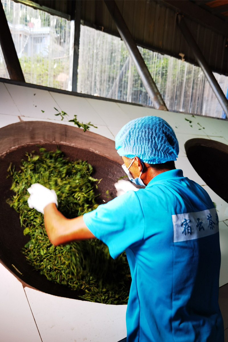 殺青是指短暫進(jìn)行高溫處理,去除茶葉中過高的水分,以軟化茶葉。殺青時間長短、鍋溫高低,直接關(guān)系到普洱茶的品質(zhì)。我們堅持采用碳火、鐵鍋、手工炒制來殺青,手工殺青要求制茶師有豐富的制茶經(jīng)驗和體力,能夠很好的掌握火候,翻炒頻率也必須均勻有序。殺青過程中,需要有一位經(jīng)驗豐富的師傅配合添柴火。柴火粗細(xì)均勻、添置的時間和節(jié)奏,都會影響鍋溫及殺青品質(zhì)。